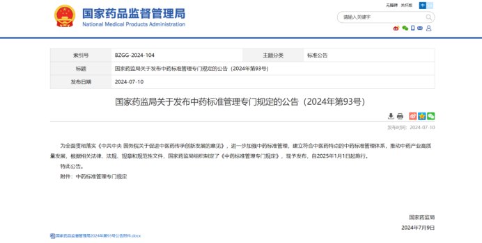 7月10日,国家药品监督管理局在官网发布了《中药标准管理专门规定》,该规定自2025年1月1日起施行。《中药标准管理专门规定》的制定和发布,对于加强中药标准管理,建立和完善符合中医药特点的标准体系,促进中医药传承创新发展,具有重要意义。